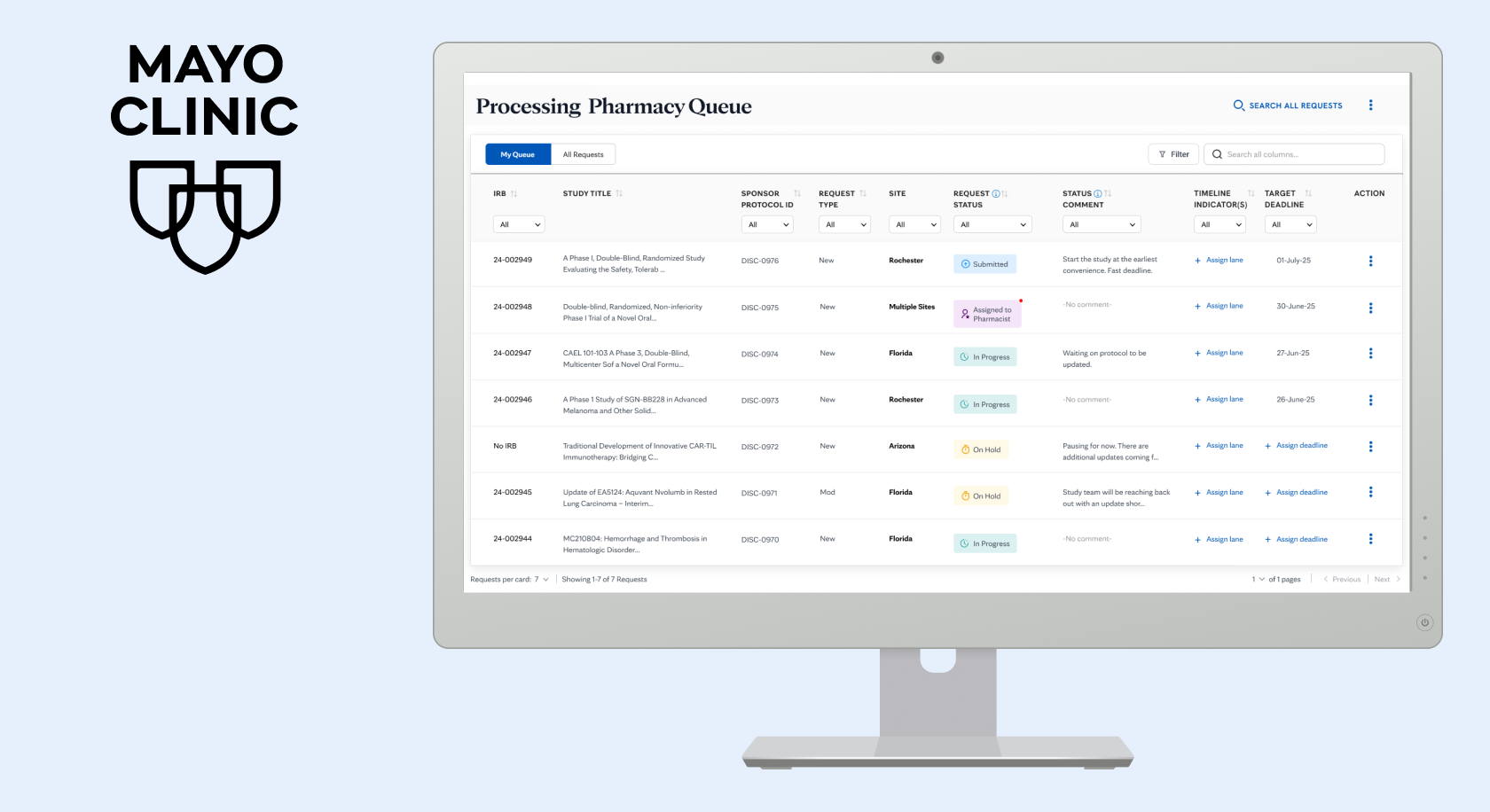 Led research and design for a research pharmacy coordination system at Mayo Clinic. Delivered ahead of schedule with a 92.4 SUS score.