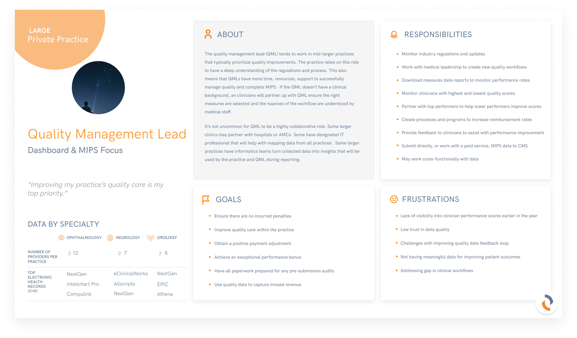 Three distinct user types emerged from the research: Practice Administrators at small to mid-size practices, Quality Management Leads at large practices, and Quality Improvement Managers at Academic Medical Centers. Each brought different goals, different levels of MIPS sophistication, and different frustrations with the reporting process. The Quality Management Lead, responsible for monitoring and submitting MIPS data across large practices, emerged as the primary driver of the submission design investment.